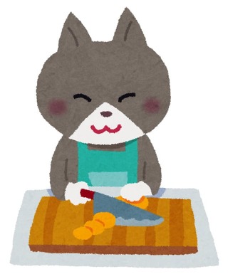 包丁を使って料理をしている猫のキャラクターのイラストです。
